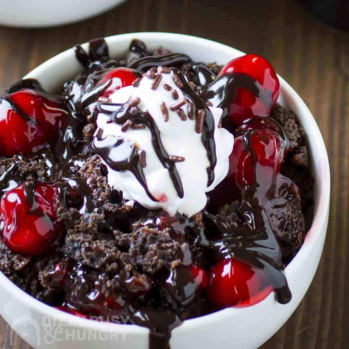 If you're looking to make this even more decadent, top with ice cream, cherry pie filling or maraschino cherries, or a drizzle of chocolate syrup. Some chocolate shavings or a dusting of cocoa powder and powdered sugar are also delicious!